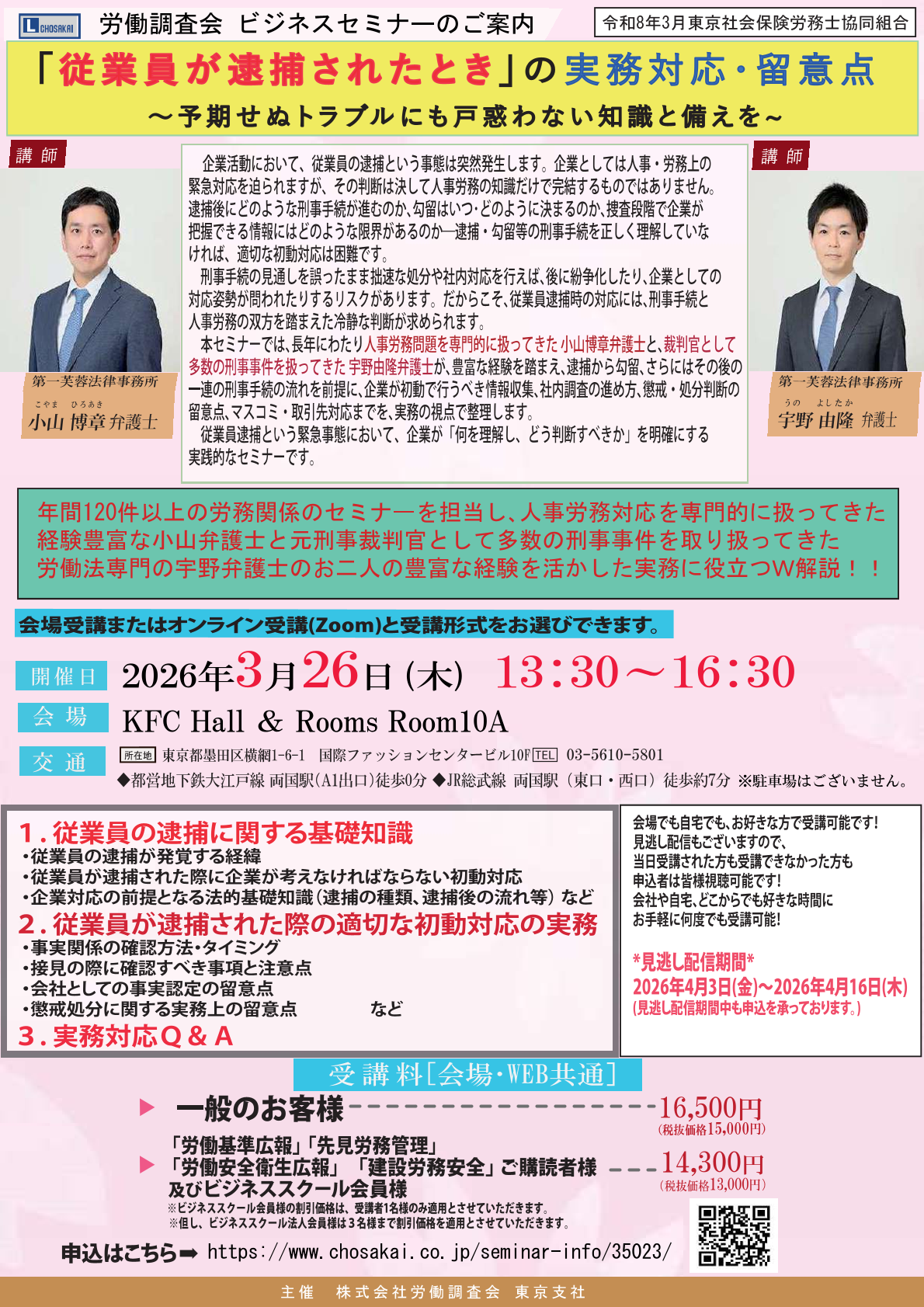 「従業員が逮捕されたとき」の実務対応・留意点セミナーのご案内